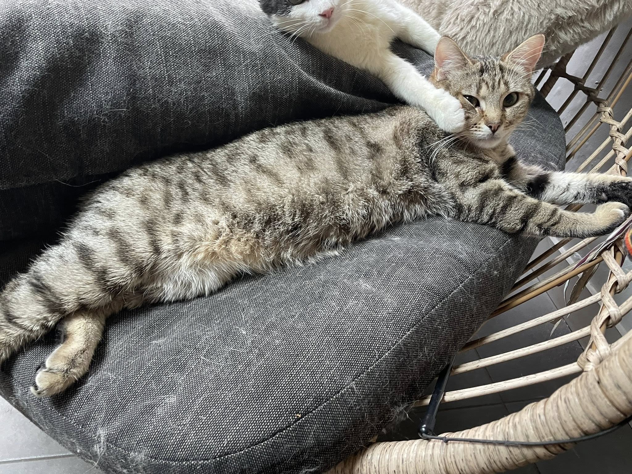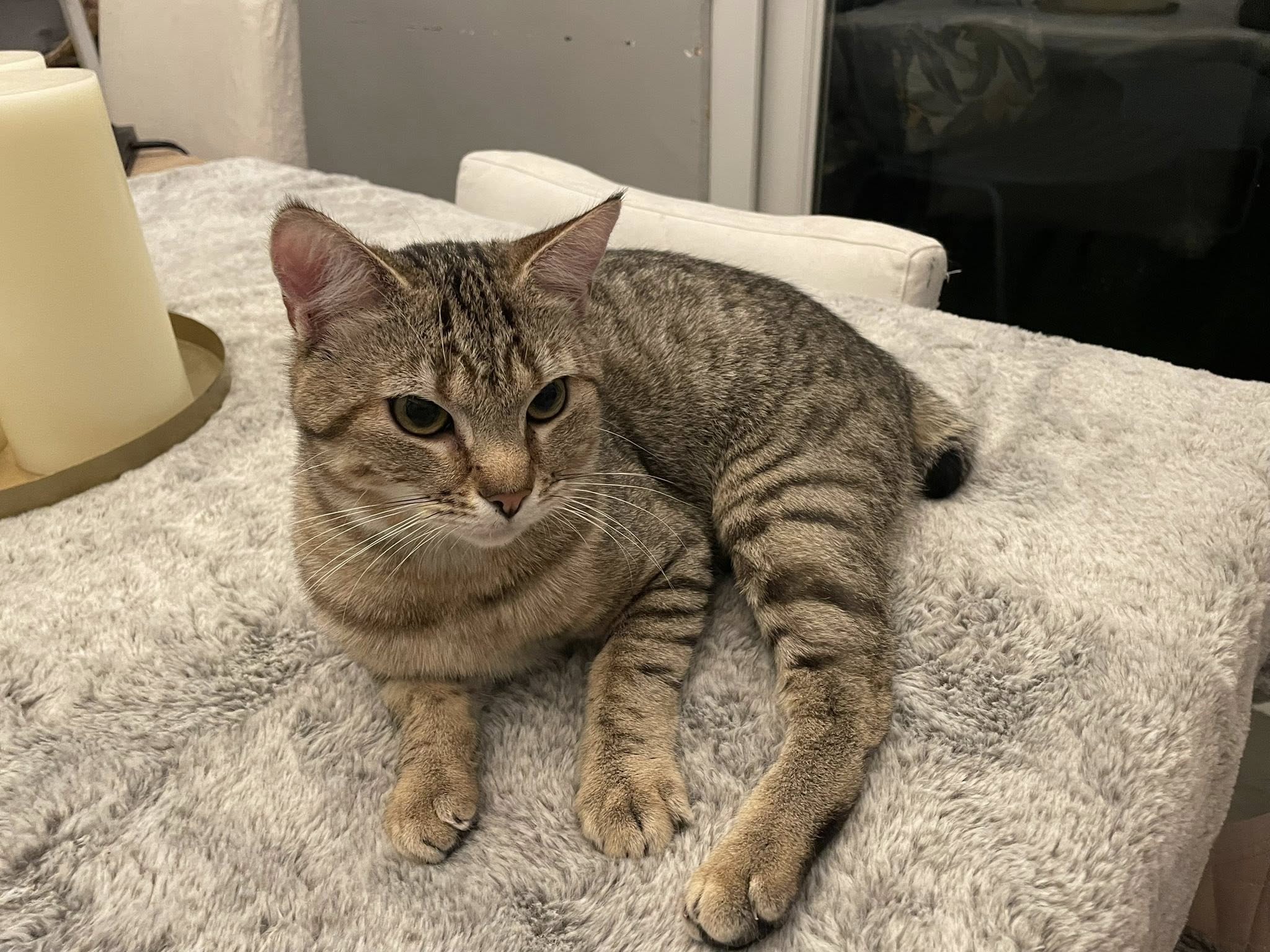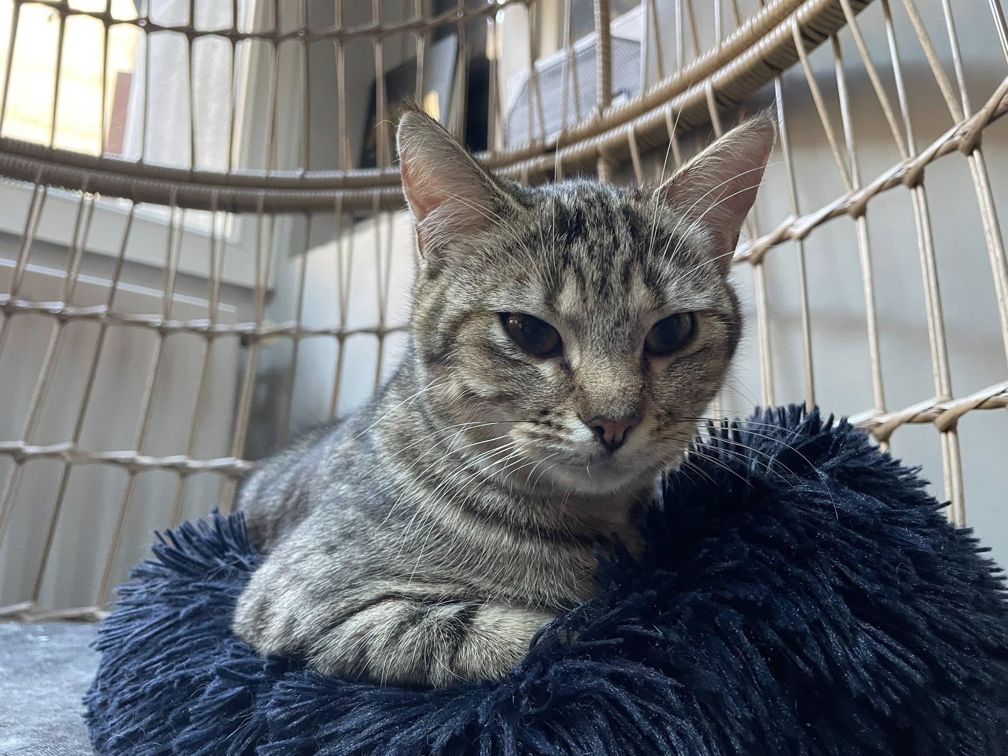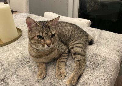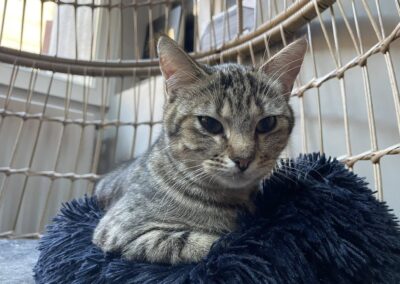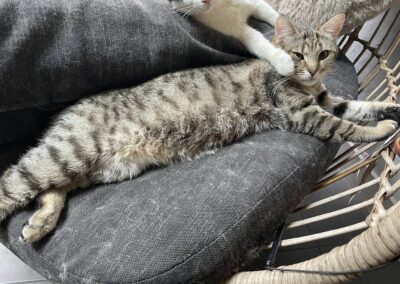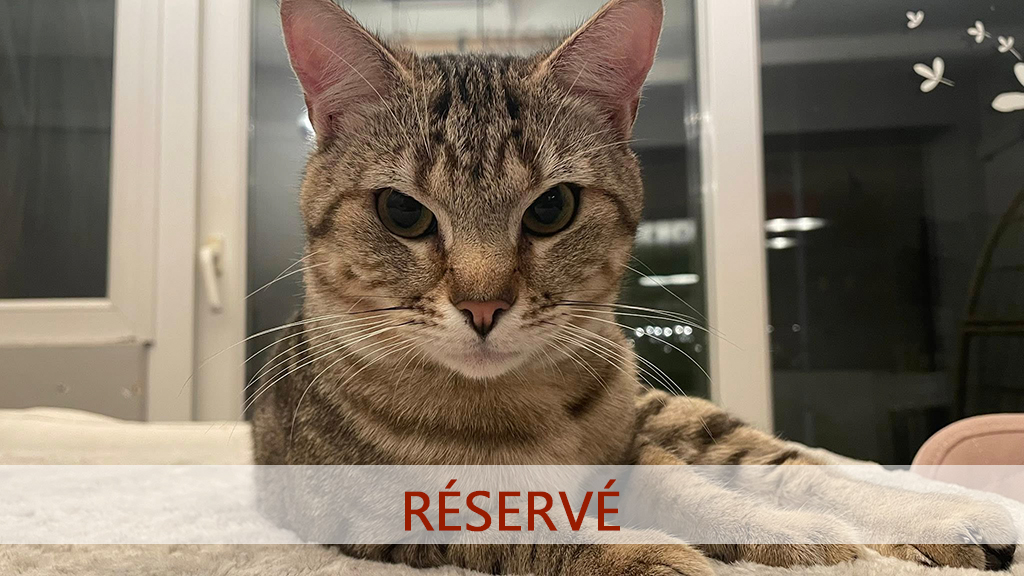 C’est un joli petit cœur tigré à prendre. Il est très timide et apprécie de pouvoir se réfugier dans son endroit sécurisé mais se laisse approcher et soigner malgré ses craintes et ne montre jamais de signe d’agressivité.